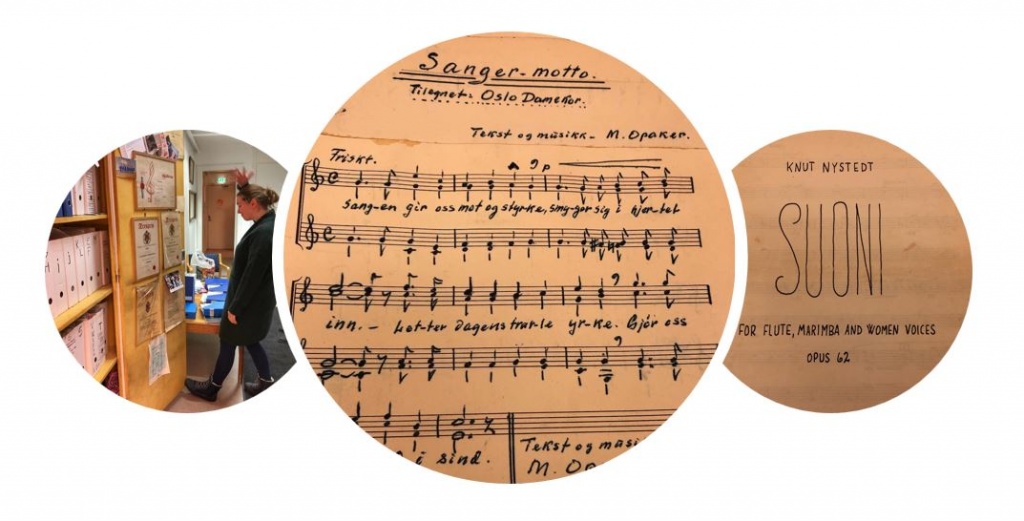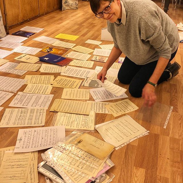 Det var noter overalt, på alle ledige bord, på stoler og benker og selvsagt utover gulvet. Små grupper med damer tok ansvar for hver sin del av alfabetet og alle titler ble nitid innført i Oslo Damekors nye, digitale notearkiv. Mengder av kopier ble kastet, originalnoter hilst med begeistring. Og dirigenten jublet da vi avdekket en sjelden skatt: «Sangermotto» ved M. Opaker, tilegnet Oslo Damekor den 15/11 1945! Den gang var Opaker forøvrig dirigent for ODK.